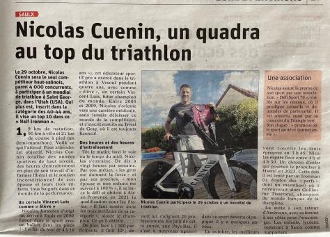 Je suis Nicolas Cuenin et je viens de Vesoul. Je participe aux championnats du monde Ironman 70.3 aux USA UTAH St George et je recherche des partenaires.